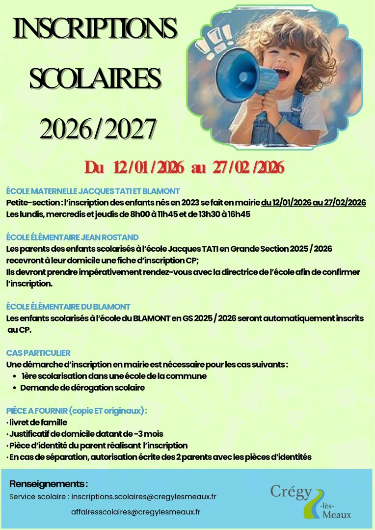 Renseignements : inscriptions.scolaires@cregylesmeaux.fr ou affairesscolaires@cregylesmeaux.fr
