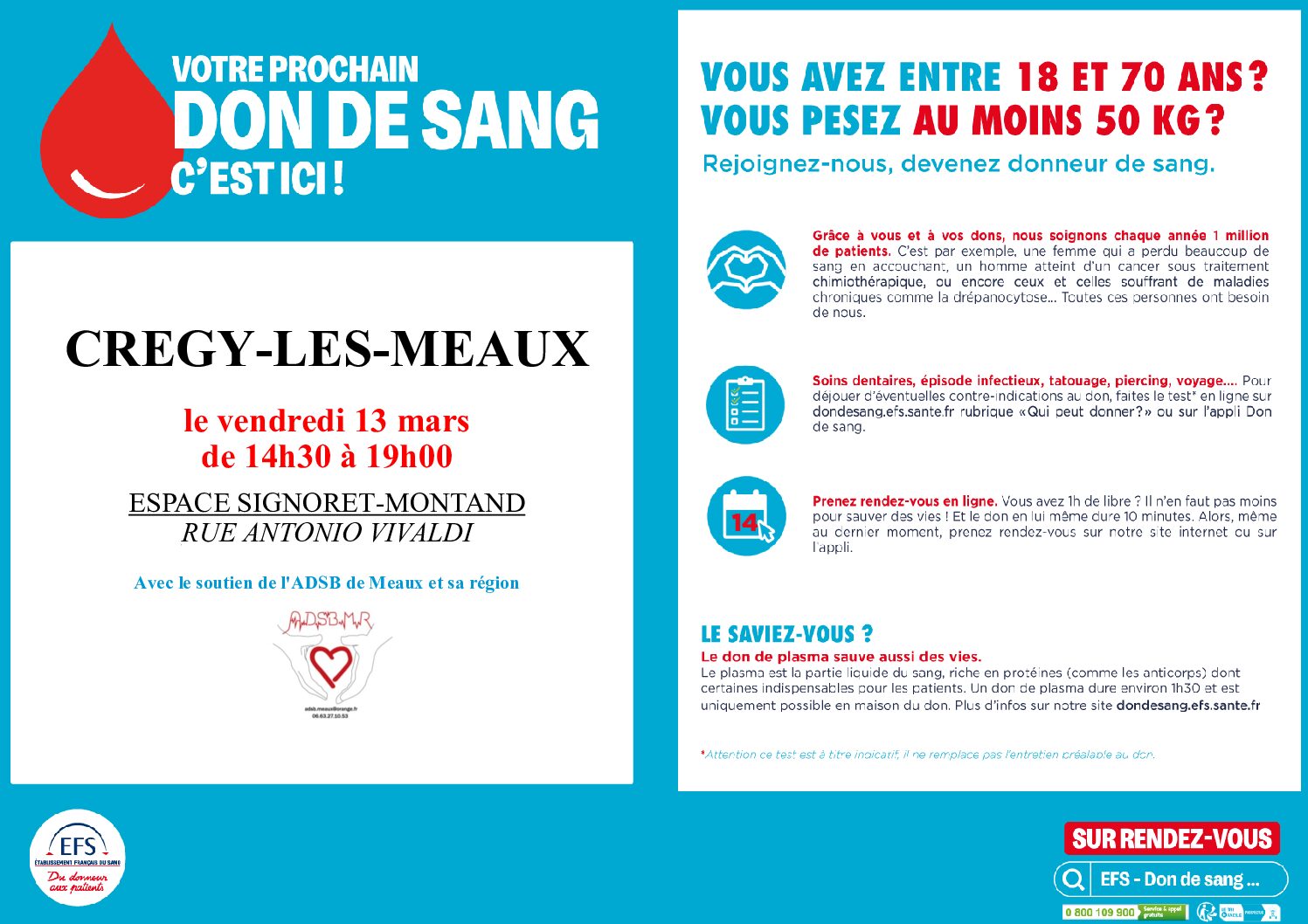 L’Établissement Français du Sang et l’ADSB de Meaux et sa Région, organisent une collecte de sang sur la commune :