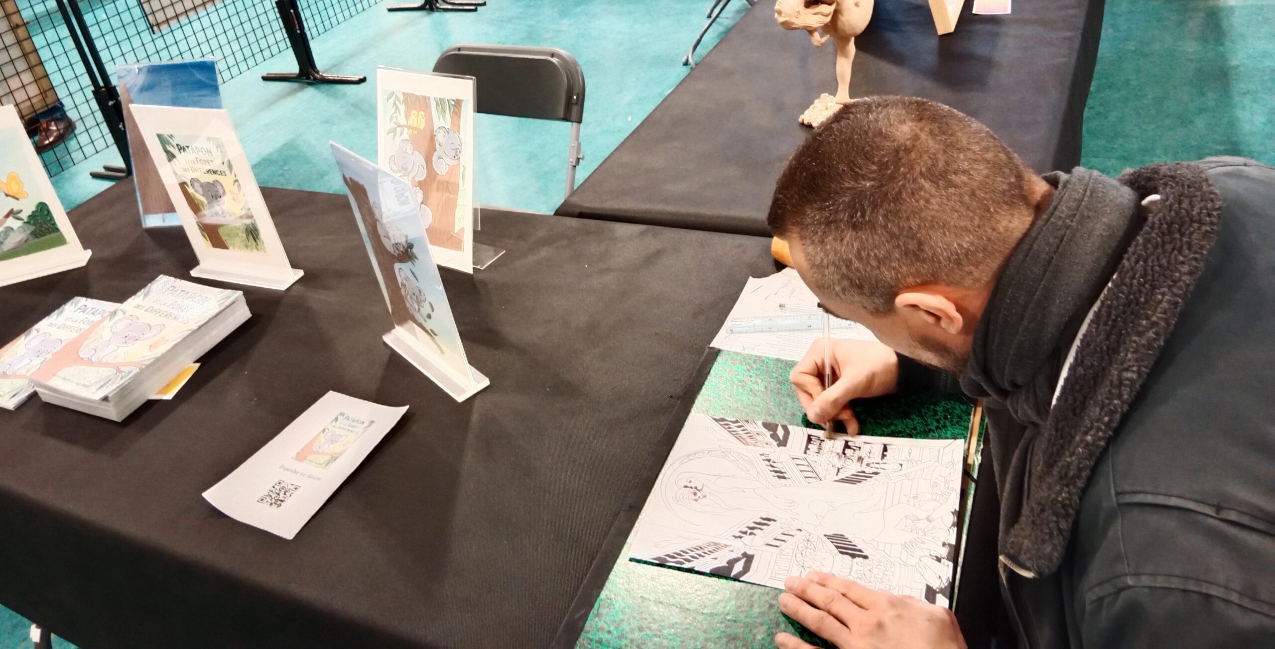 Un temps de démonstration avec Adrien Van Der Yeugt, qui a réalisé pendant le weekend, une composition en direct. Sa spécialité étant le dessin au stylo. Mme Julia AUBRY, autrice-illustratrice, a offert une lecture à voix haute de son album « Patapon et la forêt des différences » (abordant ici le handicap) pendant que des Marine Dupuich ou Emilie Goujon composaient sous nos yeux des œuvres numériques.
