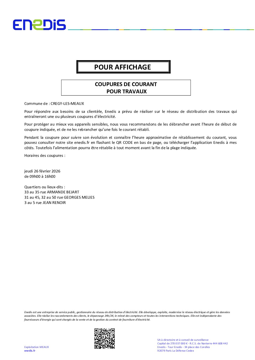 Si vous souhaitez suivre l’évolution de la coupure et connaître l’heure approximative de rétablissement du courant, vous pouvez consulter le site enedis.fr/panne-et-interruption ou télécharger l’application « Enedis à mes côtés ».